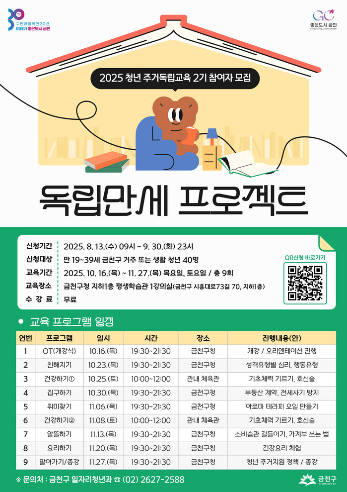 [시민일보 = 여영준 기자] 금천구(구청장 유성훈)는 청년들의 실질적인 주거 자립생활을 지원하는 교육 프로그램 ‘독립만세 프로젝트’ 2기 참여자를 오는 30일까지 모집한다고 밝혔다.