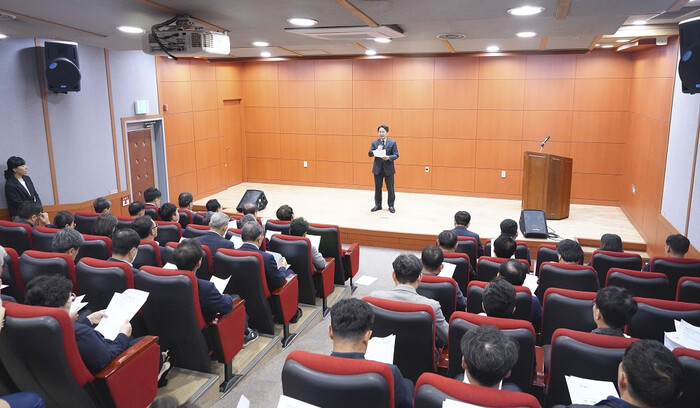 | ▲ 강기정 광주광역시장이 4일 오후 북구 국립5‧18민주묘지 민주관에서 ‘광주시-공공기관 통합 긴급 현장 간부회의’를 주재하고 있다./광주광역시 제공 |