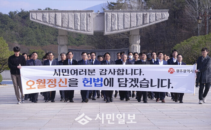 강기정 시장은 “지난해 12월 3일 계엄이 선포되자 광주시는 즉각 간부회의를 소집해 광주의 지도자들이 시청에 모인 가운데 ‘헌법수호 비상계엄 무효선언 연석회의’를 개최했다”며 “이러한 결정과 행동은 누구의 지시가 아닌 1980년 5월 광주 공동체가 우리에게 물려준 유산이었다. 바로 광주의 힘이었다. 현재를 도운 오월 영령과 과거를 잊지 않은 광주 시민들에게 다시 한 번 감사하다”고 말했다.