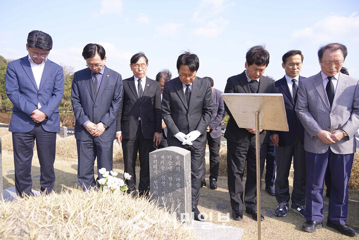 | ▲ 강기정 광주광역시장(사진 앞줄 가운데)이 4일 오후 북구 국립 5‧18 민주묘지를 찾아 광주시 간부, 공사‧공단 대표, 출자‧출연기관장 등과 ‘긴급 현장 간부회의’에 앞서 문재학 열사 묘를 참배하고 있다./광주광역시 제공 |