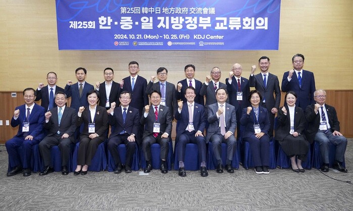 | ▲ 강기정 광주광역시장(앞줄 왼 쪽부터 다섯 번째)이 지난 21일 오후 서구 김대중컨벤션센터에서 열린 ‘제25회 한·중·일 지방정부 교류회의 개회식’ 환담장에서 유민봉 대한민국 시도지사협의회 사무총장, 양완밍 중국 인민대외우호협회 회장, 야스다 미츠루 일본 자치단체 국제화협회 이사장 등 지방정부 관계자들과 기념촬영을 하고 있다./광주광역시 제공 |