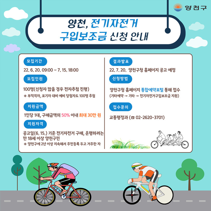 [시민일보 = 박준우 기자] 서울 양천구가 오는 20일부터 7월15일까지 전기자전거 구입보조금 신청을 접수 받는다.