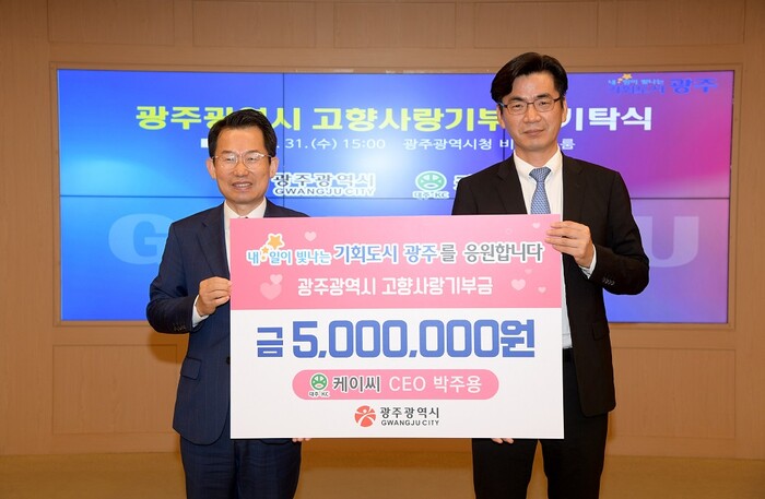 [광주=정찬남 기자] 광주광역시(시장 강기정)는 영암 대불산단에 소재한 케이씨㈜의 CEO 박주용 총괄부사장이 31일 고향사랑기부금으로 500만 원을 기탁했다고 밝혔다.