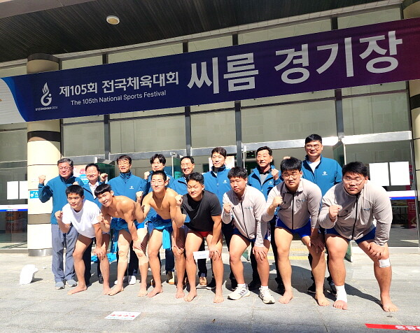| ▲ 인천시의회 교육위원회 의원들이 ‘제105회 전국체육대회’에 출전한 인천시 소속 고등학교 씨름선수단과 기념촬영을 하고 있다. (사진제공=인천시의회) |