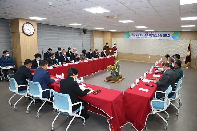 [해남=정찬남 기자] 전남 해남군의회(의장 김병덕)는 지난 17일 해남군의회 주민소통실에서 읍‧면 이장단장과의 간담회를 가졌다.
