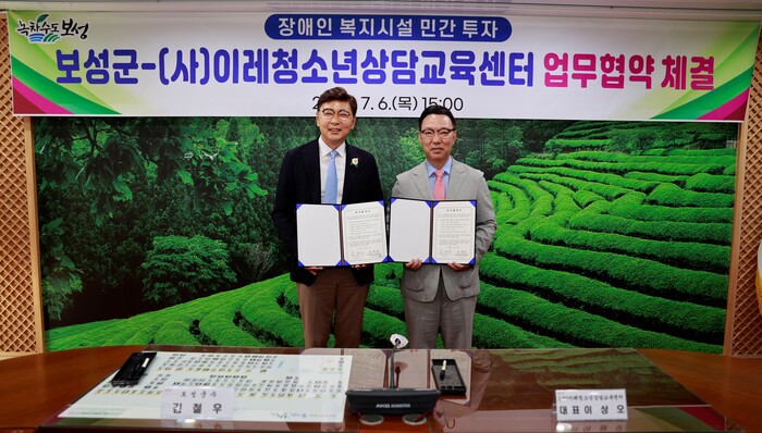 [보성=황승순 기자]보성군은 6일 군청 2층 회의실에서 보성군과 (사)이레청소년상담교육센터가 장애인 복지시설 관련 민간 투자 사업을 위한 업무협약(MOU)을 체결했다고 밝혔다.