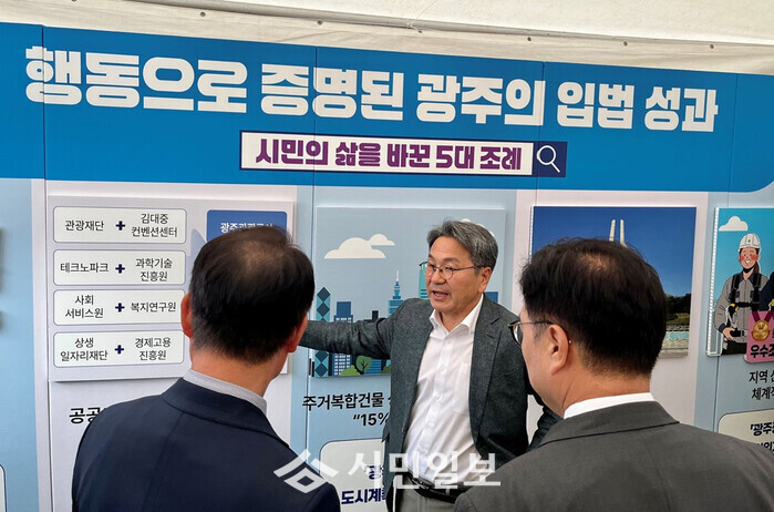 광주광역시(시장 강기정)는 23일부터 24일까지 이틀간 국회 중앙 잔디광장에서 열리는 ‘2025 국회입법박람회’에 참가해 광주시정 홍보부스에서 ‘전국 확산된 3대 혁신정책’, ‘중앙정부가 주목하는 2대 정책’, ‘국가 발전을 이끈 4대 입법 성과’를 중심으로 광주시 우수 정책들을 국민에게 직접 알렸다.
