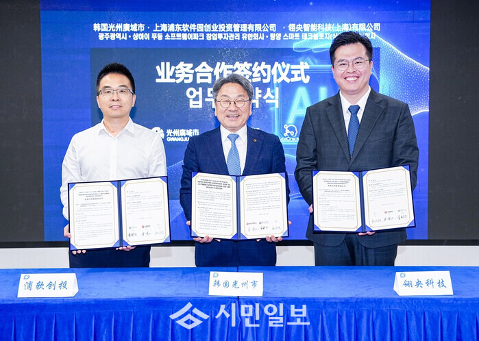 강기정 시장 등 광주광역시 대표단은 26일(현지시간) 중국 상하이 ‘푸둥 소프트웨어파크’에서 광주시–푸둥 소프트웨어파크 창업투자관리 유한회사–링양 스마트 테크놀로지 3자 간 ‘AI산업 생태계 조성과 글로벌 협력체계 구축을 위한 업무협약(MOU)’을 체결했다.