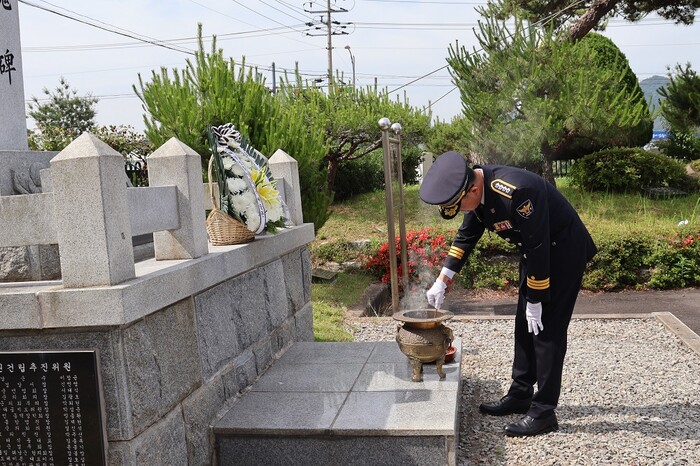 | ▲ 배승관 해남경찰서장이 오는 6일 제69회 현충일을 맞아 5일 경찰서 내에 조성된 충혼탑 향로에 순국선열 및 호국영령에 대한 제향 봉행을 하고 있다. / 해남경찰서 제공. |