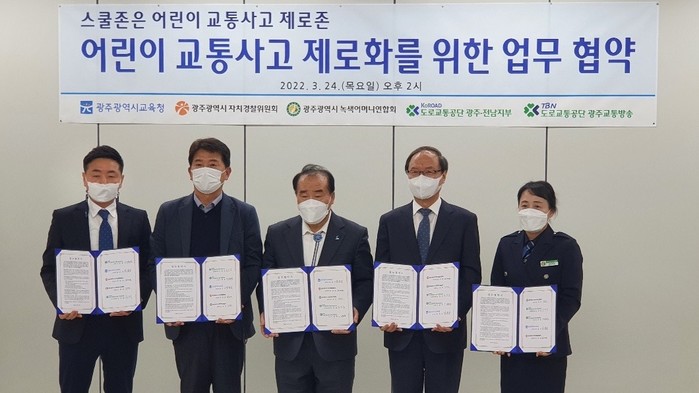 [광주=정찬남 기자] 광주광역시 자치경찰위원회는 24일 TBN 광주교통방송국에서 시교육청, TBN 광주교통방송, 도로교통공단 광주·전남지부, 광주 녹색어머니 연합회와 ‘어린이 교통사고 없는 스쿨존 만들기’를 위한 업무협약을 체결했다.