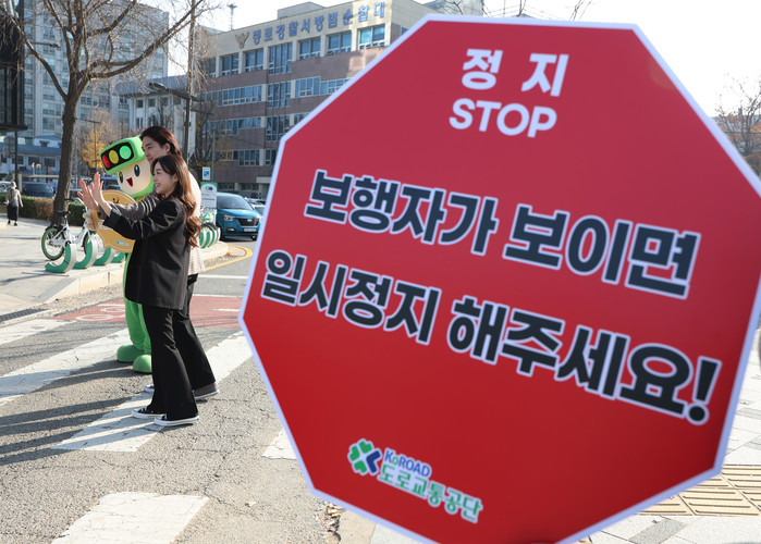 23일 오전 서울 종로구 송현동 안국동사거리에서 도로교통공단 주최로 보행자와 운전자 간 소통을 통해 안전한 교통문화를 만들기 위한 '횡단보도 손짓 캠페인'이 열려 모델들이 캠페인을 알리고 있다. '횡단보도 손짓 캠페인'은 지난 7월 보행자 보호 의무가 강회된 개정 도로교통법에 따라 횡단보도 일시정지 문화를 정착시키기 위해 마련됐다.