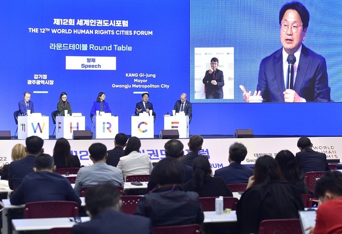 ‘인권도시와 기후정의’를 주제로 발제에 나선 강기정 광주광역시장은 “기후위기에 맞서는 인권도시의 철학과 정책은 보다 엄정해야 하고 이를 ‘기후정의’라 생각한다”며 “기후위기가 불러온 위험으로부터 모든 구성원이 평등하게 보호받을 수 있는 권리, 기후위기의 책임을 정의로운 전환의 관점에서 공정하게 배분하는 것이 중요하다”고 말했다.