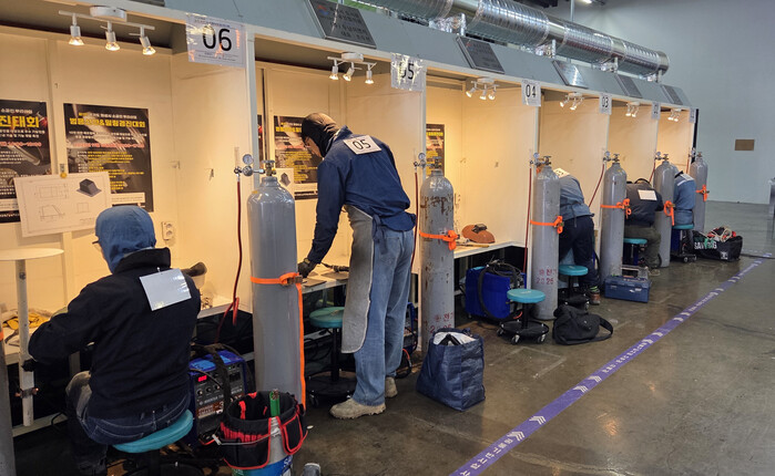 | ▲ 10일 2025년 경기도 화성시 소공인 뿌리산업 기능경진대회 용접 분야 참가자들이 과제를 수행하고 있다 /사진제공=화성특례시 |