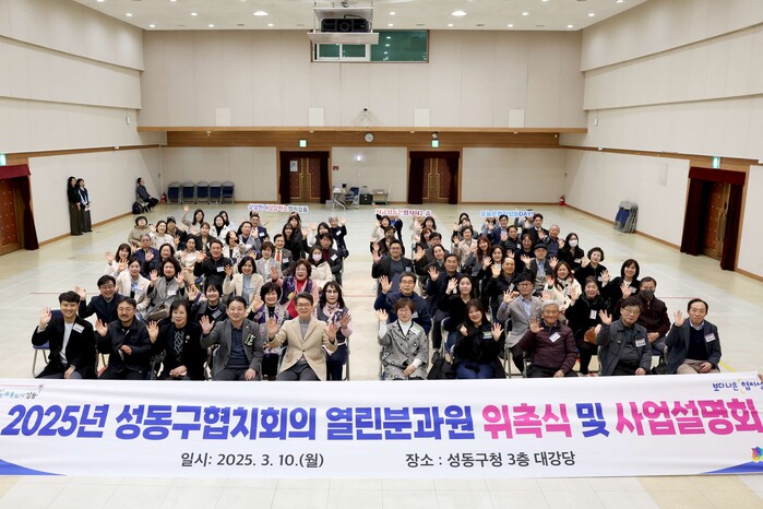 서울 성동구가 최근 구청 3층 대강당에서 ‘2025년 열린분과원 위촉식 및 사업설명회’를 개최했다. 설명회에서는 '민관협치는 차이를 빚는 예술'이라는 주제로 민관협치의 개념과 원리, 지역사회 문제의 이해, 협치 사업의 필요성에 대해 교육을 진행했다. 사진은 설명회에 참석한 정원오 구청장(앞줄 왼쪽 다섯 번째)이 관계자들과 기념 촬영을 하는 모습. (사진=성동구청 제공)
