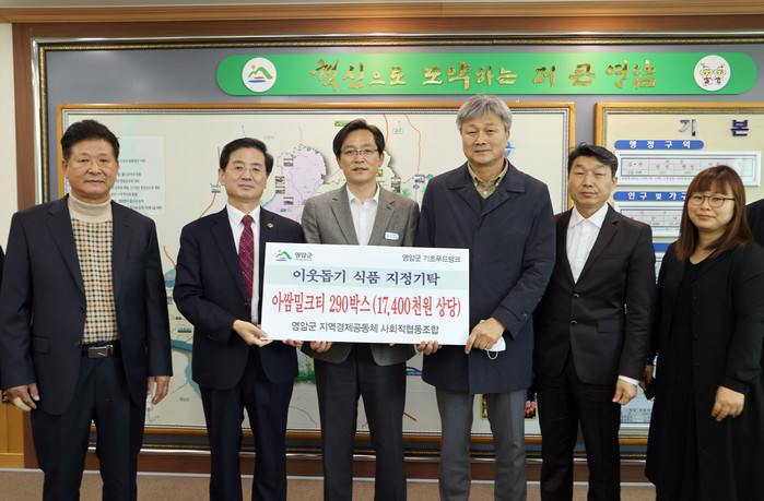 | ▲ 김성중 영암군지역경제공동체 사회적협동조합 이사장이 영암군 관내 저소득층을 위해 이웃돕기 식품 아쌈밀크티 290박스(1천7백400만 원 상당)를 영암군기초푸드뱅크(이삼행 대표)에 지정·기탁하고 우승희 영암군수 및 관계자들과 기념촬영을 하고 있다. / 영암군 제공 |