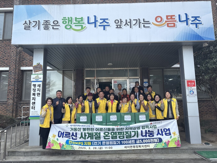 세지면지역사회보장협의체(이하 세지면지사협)는 병원 접근성이 어려운 어르신들의 건강을 위해 한전KPS의 후원으로 500만 원 상당의 온열 찜질기를 100가구에 전달했다.