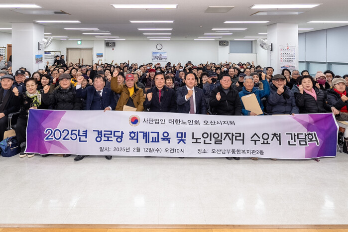 경기 오산시가 최근 오산남부종합사회복지관에서 ‘2025 경로당 회장·총무 역량강화 교육 및 간담회’를 열고, 경로당 운영 및 회계관리 교육, 보조금 집행 절차 안내, 노인 일자리 지원 사업 설명을 진행했다. 사진은 간담회에서 이권재 시장이 참석자들과 기념 촬영을 하는 모습. (사진=오산시청 제공)