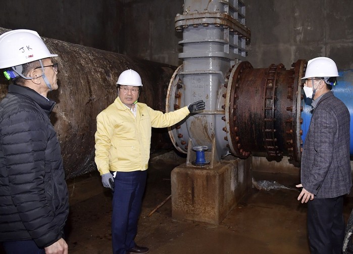 강 시장은 이날 용연정수장 지하에 위치한 정수지 유출밸브실 등을 점검하고 정수지 통합 유출밸브(전동 버터플라이밸브) 등에 이상이 없는지 확인했다. 정수지 유출밸브실은 덕남정수장 사고 지점과 동일한 곳이다.