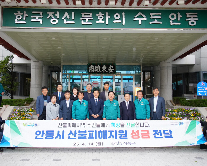 [시민일보 = 문민호 기자]임태근 서울 성북구의회 의장이 최근 이승로 성북구청장을 비롯한 주민대표단과 함께 경북 안동을 방문하여 산불피해 지원 성금 약 1억 3000만원을 권기창 안동시장과 김경도 안동시의회 의장 등을 만나 전달했다.