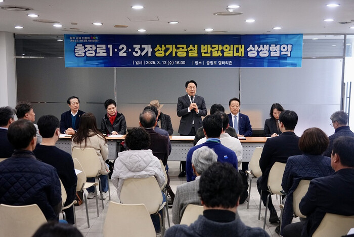 광주광역시(시장 강기정)는 충장로1‧2‧3가 상인회와 상가 건물주, 광주 동구와 함께 12일 동구 충장로 갤러리존에서 ‘충장로 1‧2‧3가 활성화를 위한 반값 임대료 상생협약식’을 개최했다.