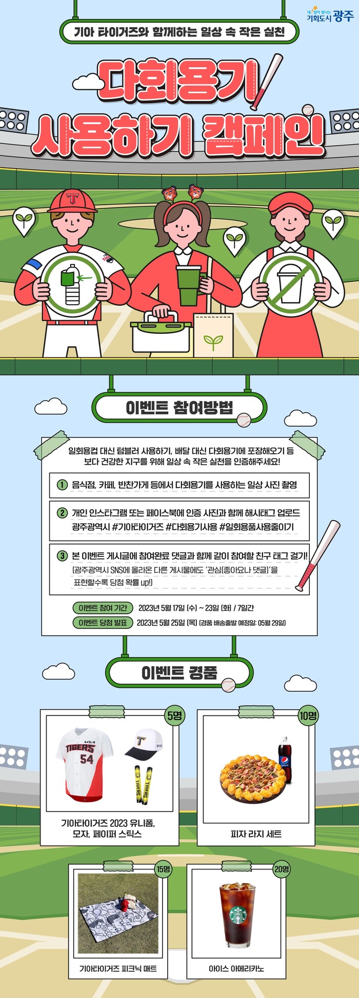 광주시는 스포츠시설 관객의 1회용품 사용 줄이기를 유도하기 위해 홈페이지, 사회관계망(SNS)을 활용해 17일부터 23일까지 ‘다회용기 사용하기 캠페인’을 진행한다. 음식점, 카페 등에서 개인용기 등을 사용하는 사진을 찍어 인증하면 추첨을 통해 KIA타이거즈 제복(유니폼), 모자, 친환경 응원봉 등 경품을 증정한다.