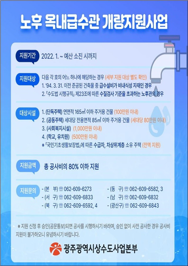광주광역시상하수도사업본부가 실시하는 이번 사업에는 개량(교체·갱생), 세척 공사비 지원 등을 통해 각 가정의 수도꼭지까지 교체하고 옥내급수관 노후로 인한 수질 저하 등 시민 불편을 적극적으로 해소하기 위해 사업을 실시하고 있다.