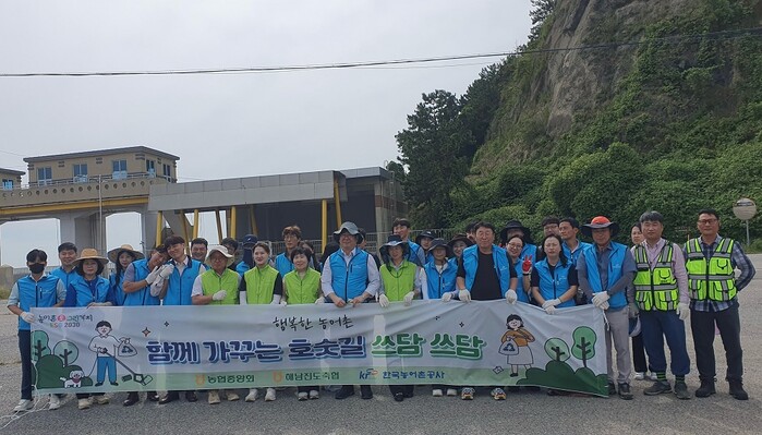 | ▲ 한국농어촌공사 해남·완도지사, 26일 해남군 황산면 고천암 방조제에서 농협중앙회 해남군지부, 해남진도축협, 황산면민과 ‘행복한 농어촌, 함께 가꾸는 호숫길 쓰담쓰담’ 캠페인 / 해남완도지사 제공 |
