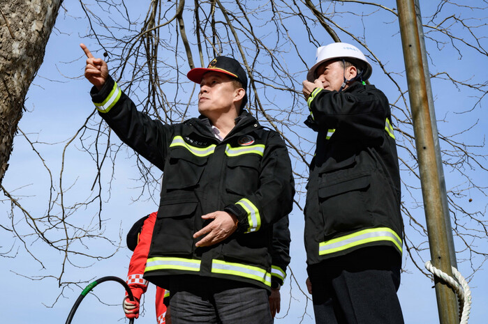 경기 수원시가 최근 이재준 시장 및 수원소방서·중부경찰서 관계자 등 300여명이 참여한 가운데, 장안구 하광교동 광교임시수련원에서 ‘2025년 봄철 유관기관 합동 산불진화 모의훈련’을 하고, 산불진화 체계 등을 점검했다. 사진은 이 시장(왼쪽)이 봄철 유관기관 합동 산불진화훈련을 참관하는 모습. (사진=수원시청 제공)