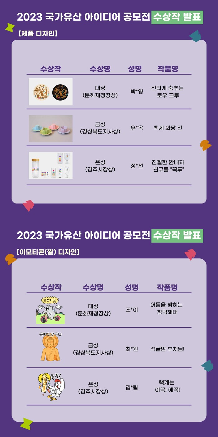 한편, 지난 6월 1일부터 3주간 접수를 받아 진행한 국가유산 아이디어 공모전은 제품 분야 43개, 이모티콘(짤) 분야 125개로 총 168개의 작품이 접수되어 작년보다 2배 많은 출품수량을 접수 받았고, 전문심사위원의 심층 심사를 통해 제품 분야 3개, 이모티콘(짤) 분야 3개로 총 6명의 수상자가 최종 선정되었다.