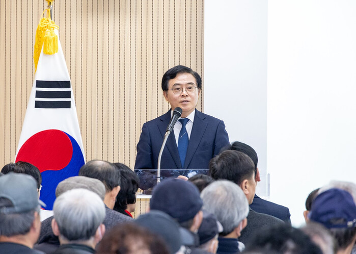 진교훈 서울 강서구청장이 최근 내발산복합복지센터에서 열린 ‘대한노인회 강서구지회 제48회 정기총회’에 참석했다. 사진은 진 구청장이 인사말하는 모습. (사진=강서구청 제공)