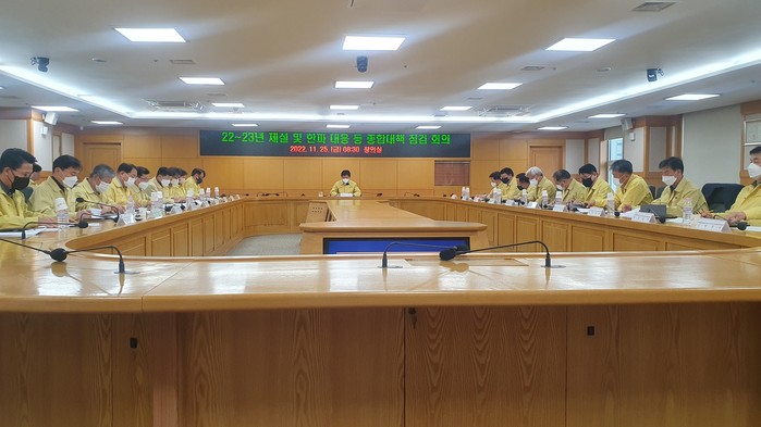 경기 부천시가 최근 '2022~2023년 제설 및 한파 대응 종합 대책 점검 회의'를 개최했다. 회의에서는 겨울철 도로 제설 대책, 한파 취약계층 보호 대책 등 다양한 방안을 개진하고 점검했다. 사진은 조용익 시장(가운데)이 겨울철 제설·한파 대응 등 종합대책 점검 회의를 주재하고 있는 모습. (사진제공=부천시청)