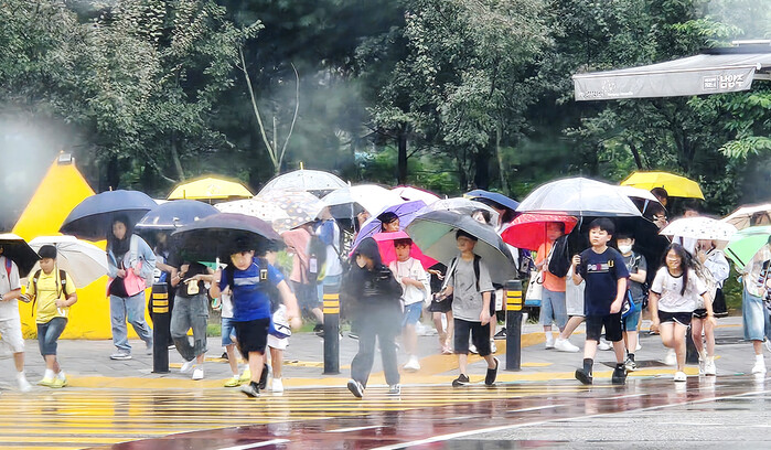 갑작스러운 쏟아지는 비에도 시민들은 우산을 단단히 움켜쥔 채 일상의 걸음을 멈추지 않았다. 노란 우산, 아이들의 책가방, 반짝이는 젖은 도로와 하늘을 가득 메운 짙은 수목의 배경이 마치 한 폭의 그림처럼 다산동의 활기와 여름비의 정취를 전한다. (사진=최광대 기자)
