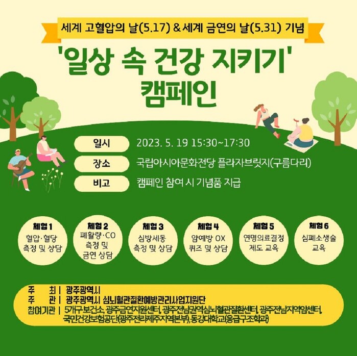이 행사는 광주시와 광주 심·뇌혈관질환 예방관리사업 및 통합건강증진사업 지원단, 5개 자치구 보건소, 광주·전남지역암센터, 국민건강보험공단(광주전라제주본부), 광주금연지원센터, 동강대학교 응급구조학과 등 11개 민·관·학 관계자 30여 명이 참여한다.