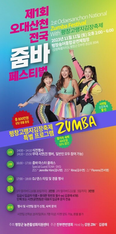 줌바피트니스 애호가 500여명이 평창송어공연종합체험장에 모여 줌바 실력을 견주고 김장체험도 참가해 친목을 다질 예정이다. 이 행사는 스페셜 게스트인 제니퍼 김(김나영), 리나(김수연), 플로란스(전서영)이 진행하는 줌바 마스터클래스, 줌바 시연, 댄스 타임과 경품 증정 등으로 구성됐다.