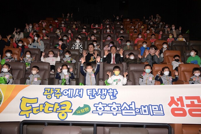 [광주=정찬남 기자] 강기정 광주광역시장과 문화산업과 직원, 어린이집 원아 80여명은 23일 CGV광주하남에서 지역 콘텐츠기업이 제작한 영화 ‘두다다쿵: 후후섬의 비밀’을 관람했다.