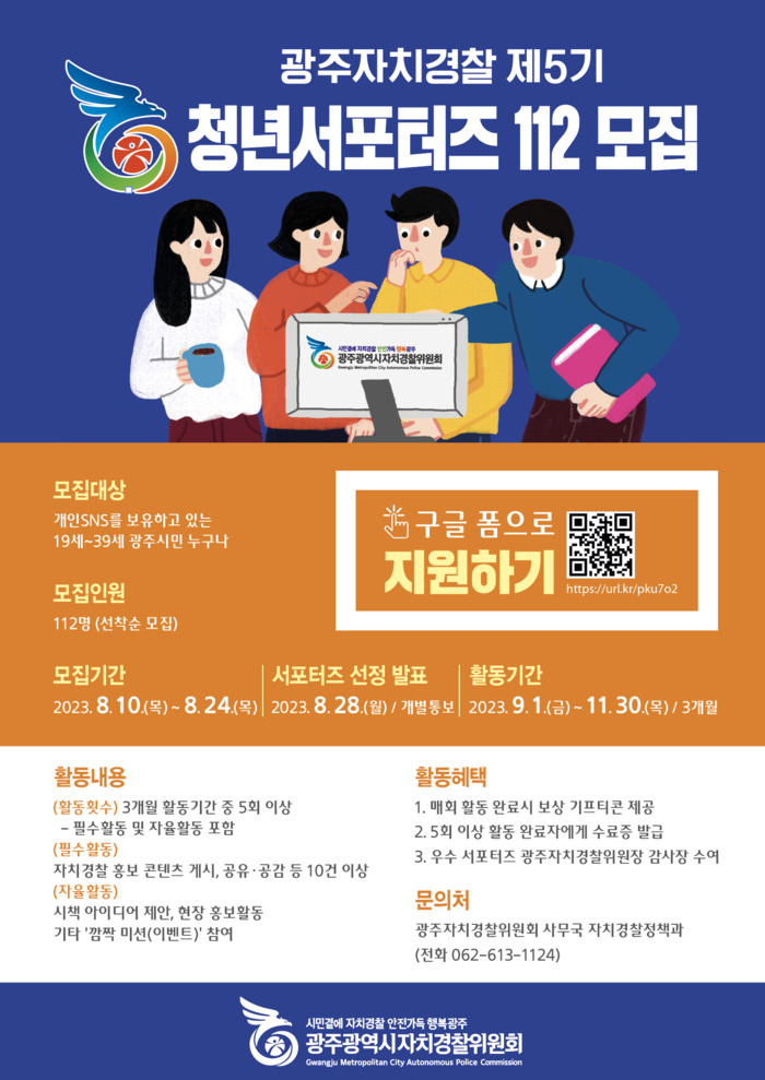 한편 올해 3월부터 6월까지 활동한 제4기 서포터즈는 사회관계망서비스(SNS)와 메신저 등을 통해 광주자치경찰 홍보 카드뉴스, 영상 등을 4000회 이상 게시·공유하고, 창작 홍보물과 시책 아이디어 등 24건을 제안했다.