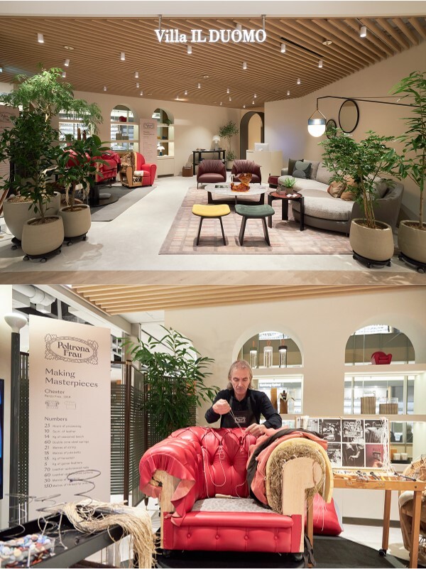 Poltrona Frau(폴트로나 프라우)와 Ceccotti collezioni(체코티 콜레지오니)의 공동 창작 Duo collection(듀오 콜렉션)는 이탈리아 돌체비타의 경쾌함과 복고풍 실루엣의 시대적 정신을 포착, 현대적으로 해석하여 공간과 조화를 이룬다. 특히, 곡선형 Duo Sofa(듀오 소파)는 ‘빌라 일 두오모’에 국내 최초로 전시되는 제품이다.