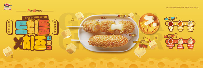 ‘트리플X치즈 핫도그’는 소시지, 모짜렐라 치즈, 체다치즈가 들어있고 고다치즈 알갱이가 토핑으로 뿌려져 있어 풍부한 치즈와 짭짤한 맛까지 즐길 수 있다.