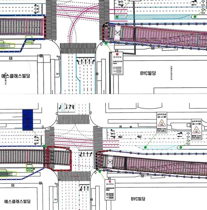 | ▲ 본선7구간 당초 교통처리계획도면 상단과 하단 변경안 / 광주광역시 제공 |