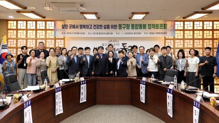 | 동구의회 ‘동구형 통합돌봄 정책 토론회’ 참가자들이 포즈를 취하며 기념촬영을 하고 있다. (사진=동구의회) |