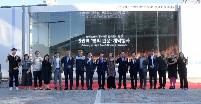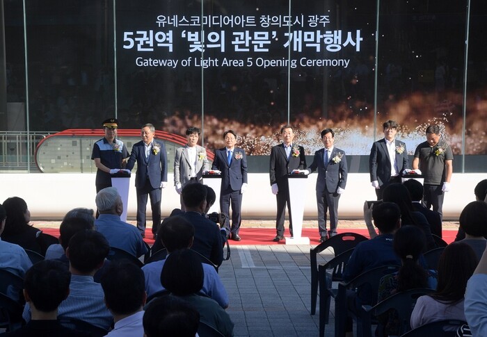 | ▲ 강기정 광주광역시장(왼 쪽부터 네 번째)이 30일 오후 송정역 광장에서 열린 미디어아트 창의밸트 5권역 개막식에 참석하여 참석자들과 함께 '빛의 관문' 개막을 알리는 세레모니를 하고 있다. /광주광역시 제공 |