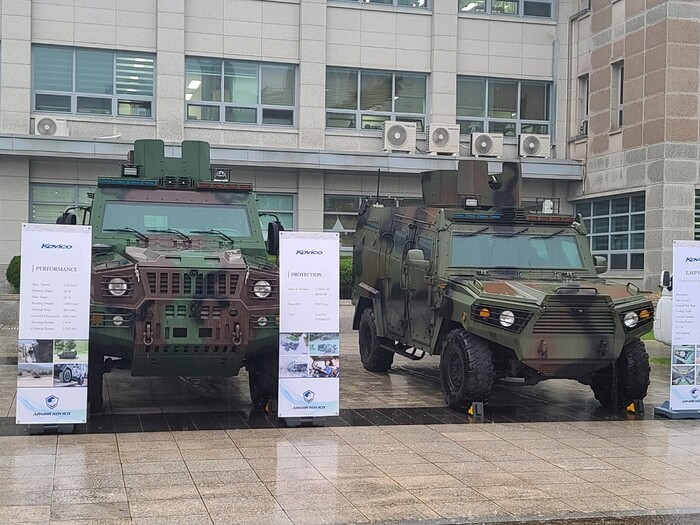 [광주=정찬남 기자] ‘미래모빌리티 선도도시 광주’에서 생산한 자율주행 셔틀버스와 폭발물방호차량이 ‘국제군수포럼’에 출품됐다.