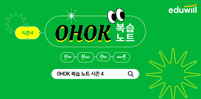 OHOK 복습 노트는 업계 최초로 에듀윌의 기억강화 시스템에서 제공하는 ‘One Hour One Week 복습 강의’와 함께 학습할 수 있는 복습 노트를 의미한다.