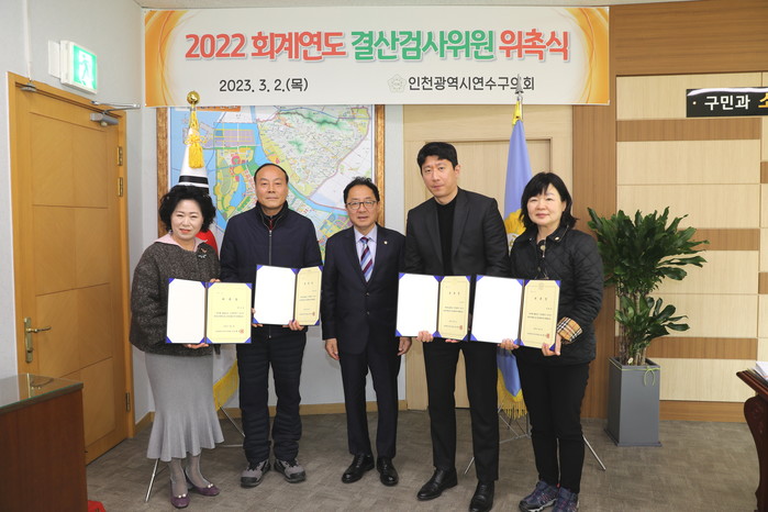 [인천=문찬식 기자] 인천 연수구의회가 최근 의장실에서 ‘2022 회계연도 결산검사위원’에게 위촉장을 수여했다.