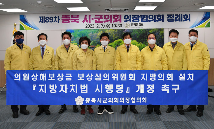 충북시·군의회의장협의회(회장 최충진)는 9일 증평군의회에서 89차 충북시·군의회의장협의회 정례회를 열고 ‘의원상해보상금 보상심의위원회 지방의회 설치를 위한 『지방자치법 시행령』 개정 건의문’ 1건을 채택하고 행정안전부 등 관계기관에 건의문을 송부했다.