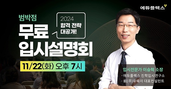 해당 설명회는 11월22일 화요일 오후 7시 범박 에듀플렉스에서 진행되며 에듀플렉스 홈페이지 및 범박점 블로그를 통해 신청이 가능하다.