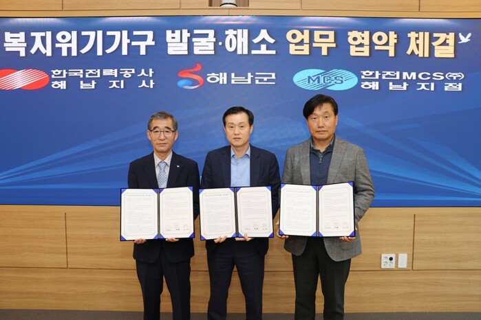 협약에 따라 한전 해남지사는 사용량 이상 고객을 주기적으로 확인해 이상 발견 시 해당 정보를 해남군에 제공하고, 한전MCS 해남지점은 세대 별 검침, 전기요금고지서 송달 시 위기 가구로 확인된 정보를 군에 제공하게 된다.