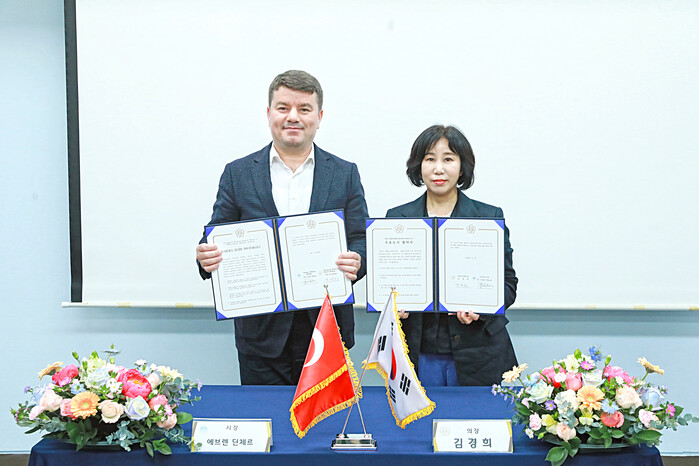 | ▲ 협약서 체결 후 기념촬영을 하고 있는 김경희 의장과 에브렌 딘체르 시장.(사진=화성시의회 제공) |