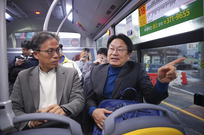 | ▲ 강기정 광주광역시장(오른 쪽)이 ‘대·자·보(대중교통‧자전거‧보행 중심) 도시 광주’ 실현을 위해 11일 오전 북구 문흥동 자택에서 시청까지 버스를 타고 출근하며 시민과 대화하고 있다./광주광역시 제공 |