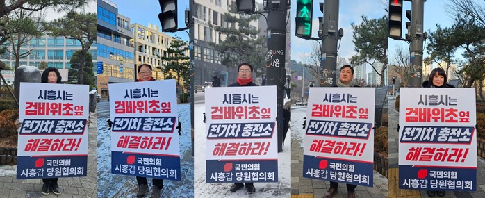 | 국민의힘 소속 시흥시 갑지역 의원들이 검바위초 옆 충전소 문제해결을 신속 처리를 요구하며 1인 시위에 나섰다. |